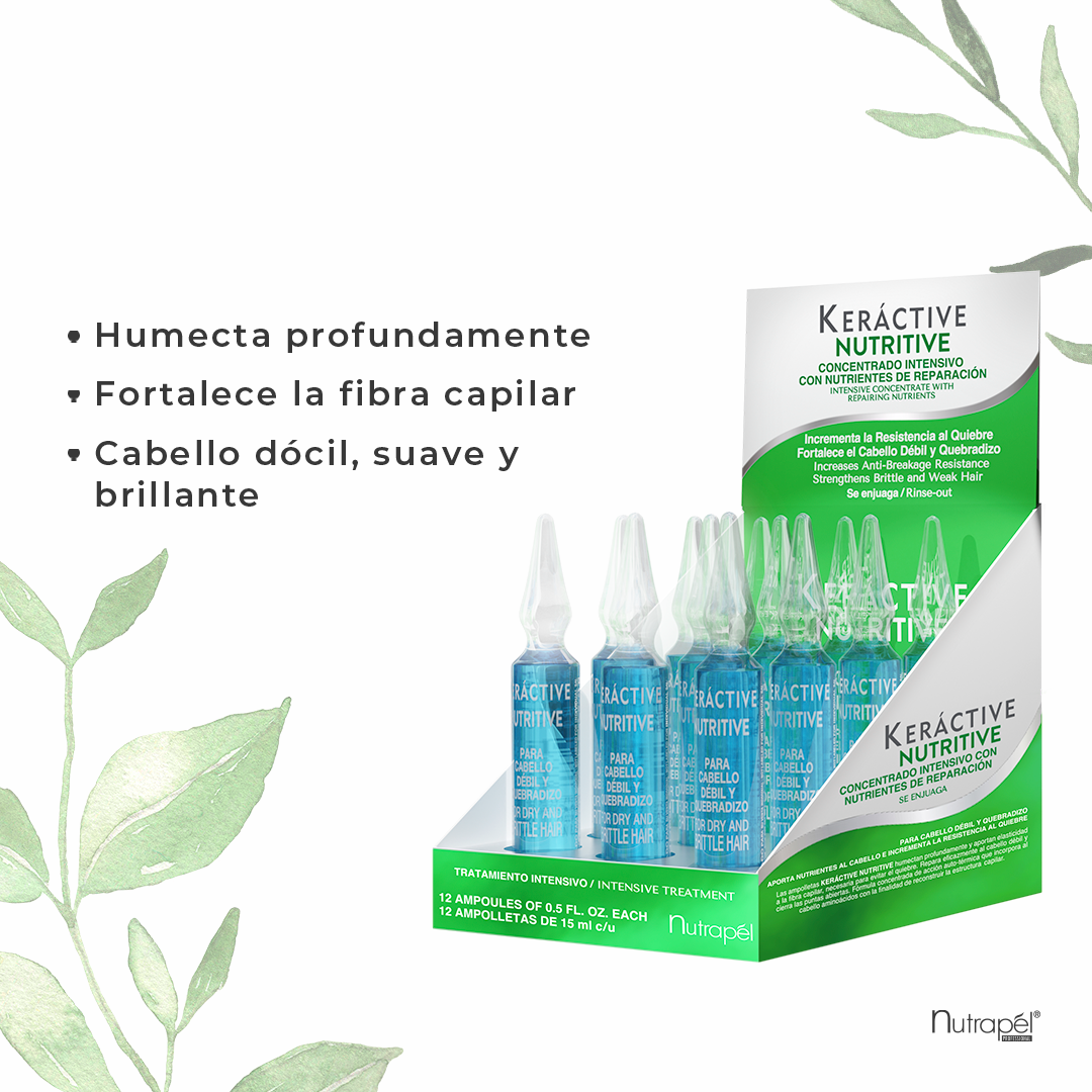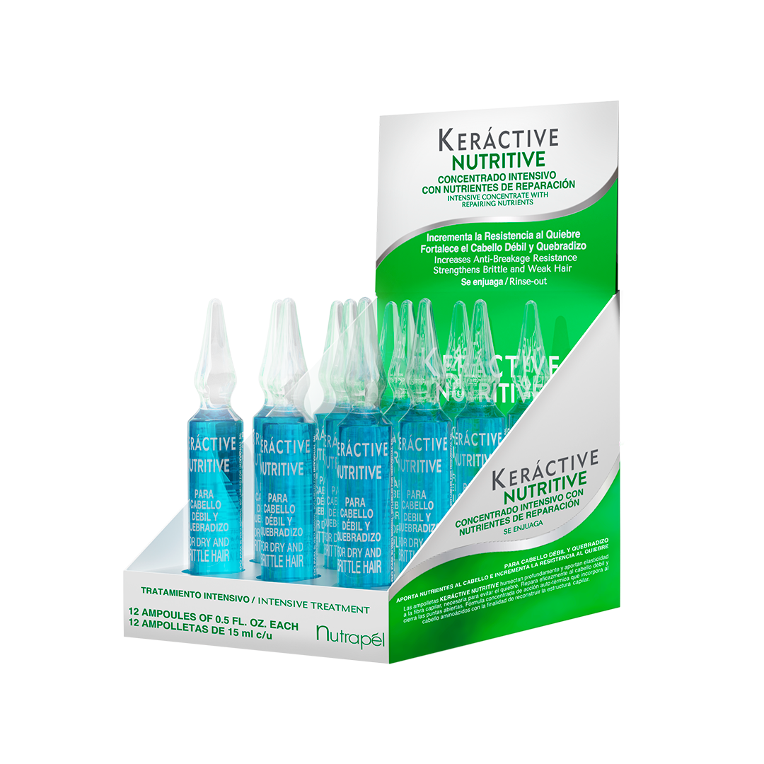 Exhibidor con 12 ampolletas para cabello deshidratado que humecta intensamente e incrementa la resistencia y fuerza del cabello.
