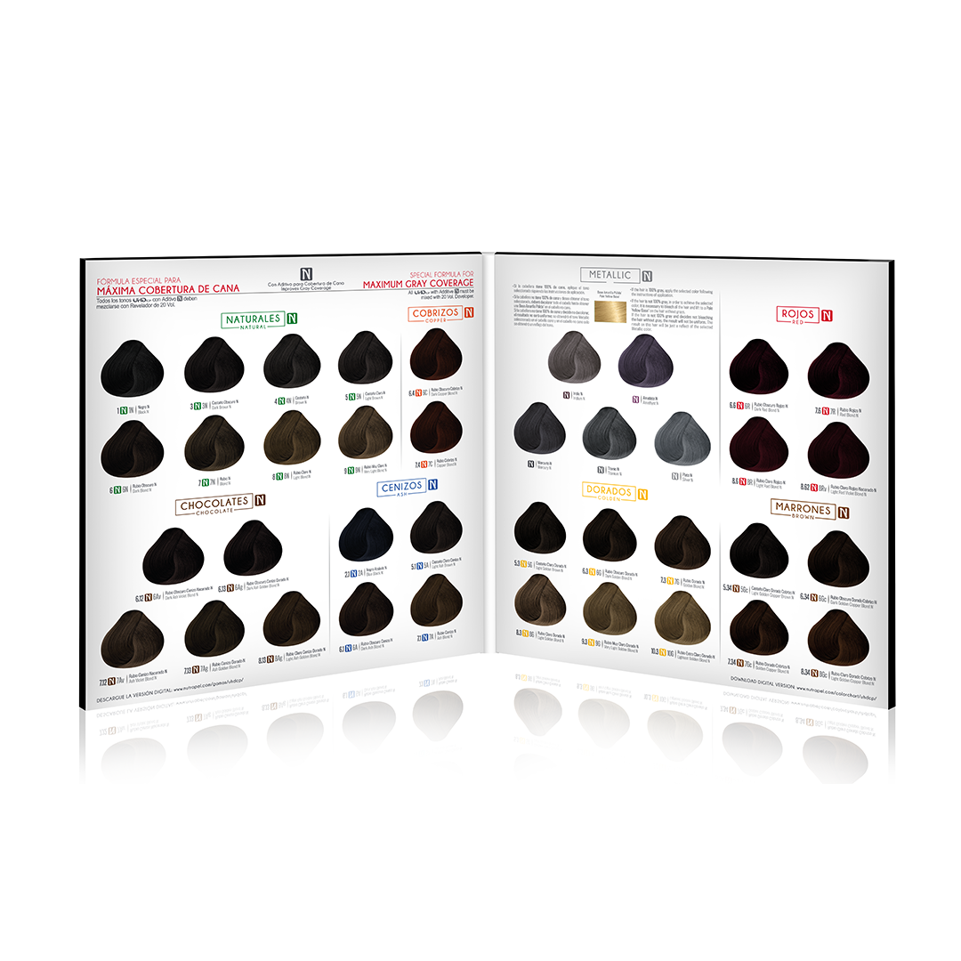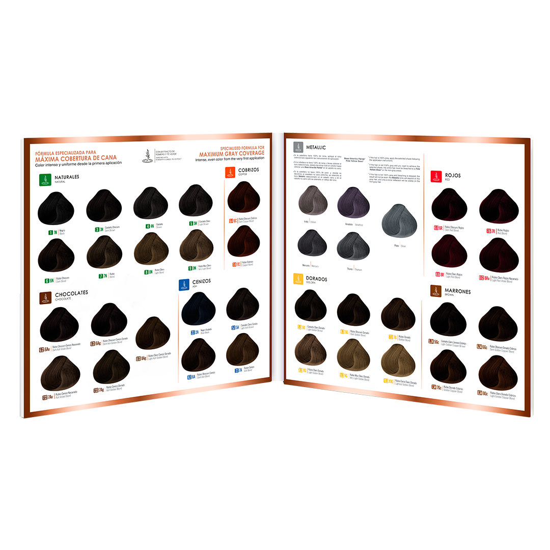 Amplia gama de coloración profesional con 38 tonos exclusivamente diseñados para una Máxima Cobertura de Cana.