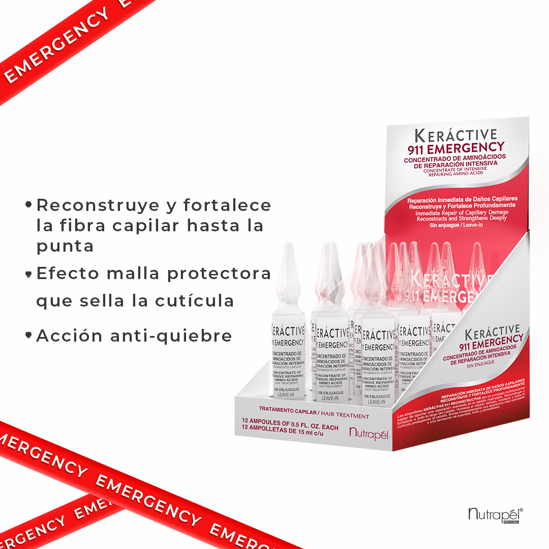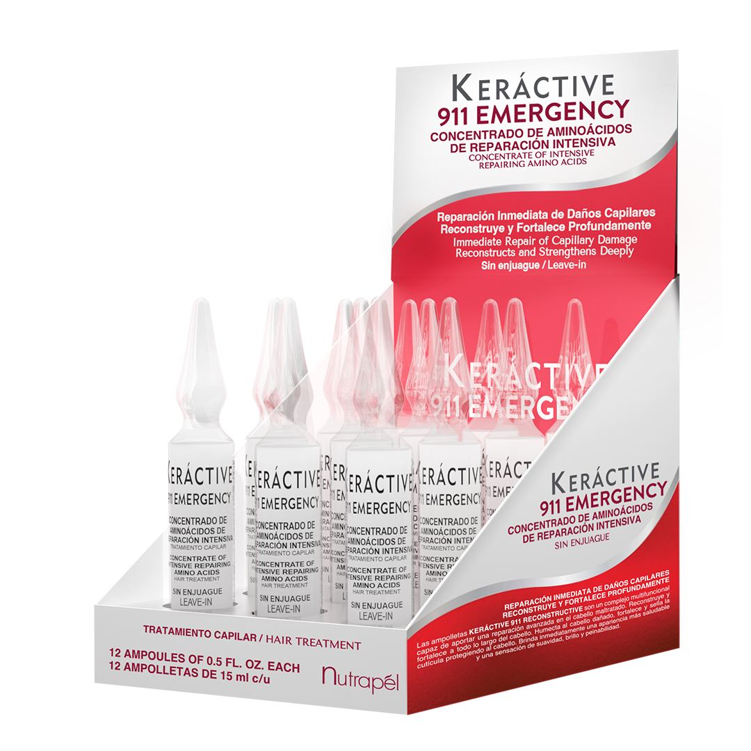 Exhibidor con 12 ampolletas que reparan inmediatamente el daño capilar.