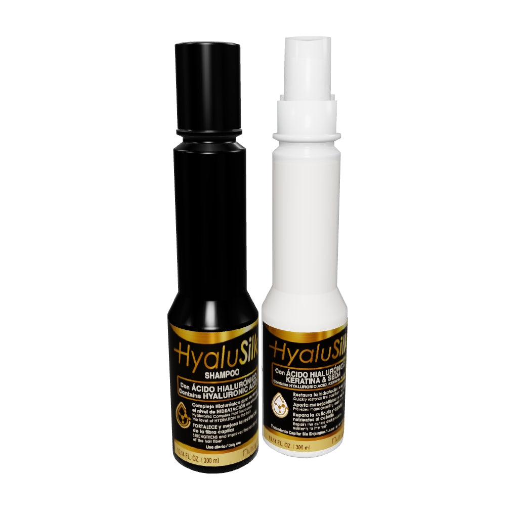 Shampoo Hyalusilk y Tratamiento Bifásico para un cabello más hidratado, brillante y visiblemente más saludable.