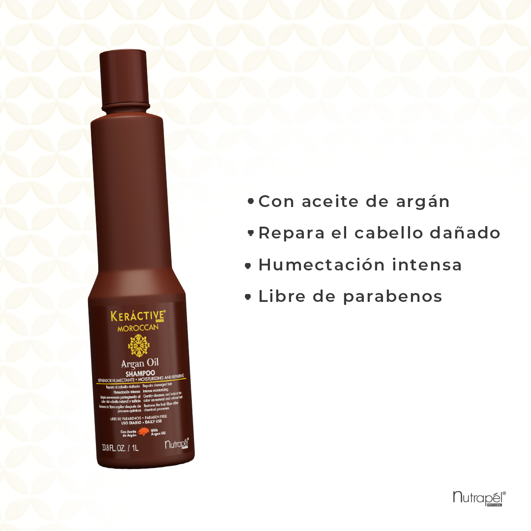 Shampoo con aceite de Argán que ayuda a prevenir el estrés oxidativo y reduce el daño diario en el cabello.